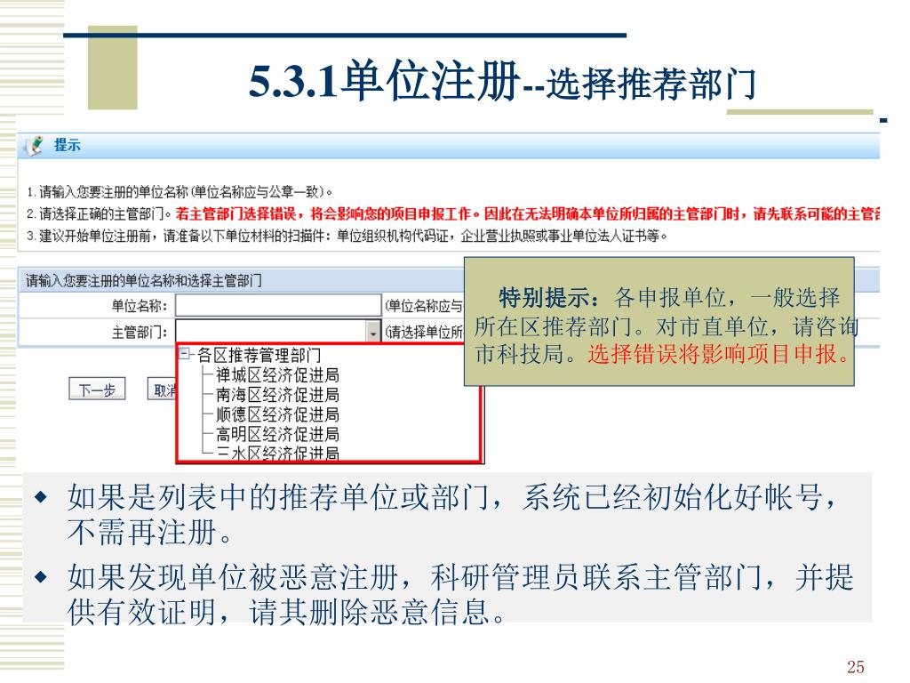 5.3.1单位注册--选择推荐部门 特别提示:各申报单位,一般选择 所在区推荐部门。对市直单位,请咨询 市科技局。选择错误将影响项目申报。 • 如果是列表中的推荐单位或部门,系统已经初始化好帐号,不需再注册。 • 如果发现单位被恶意注册,科研管理员联系主管部门,并提供有效证明,请其删除恶意信息。