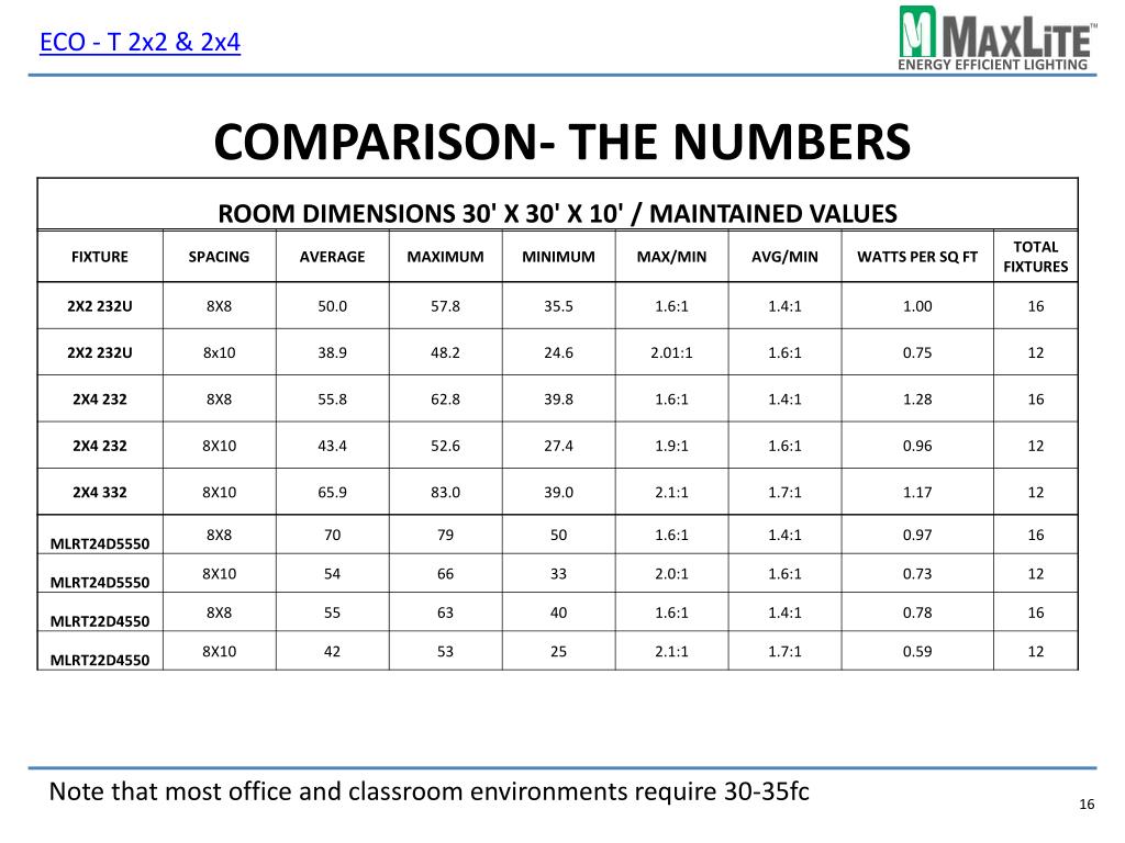 ECO - T 2x2 & 2x4 Comparison- the numbers Note that most office and classroom environments require 30-35fc