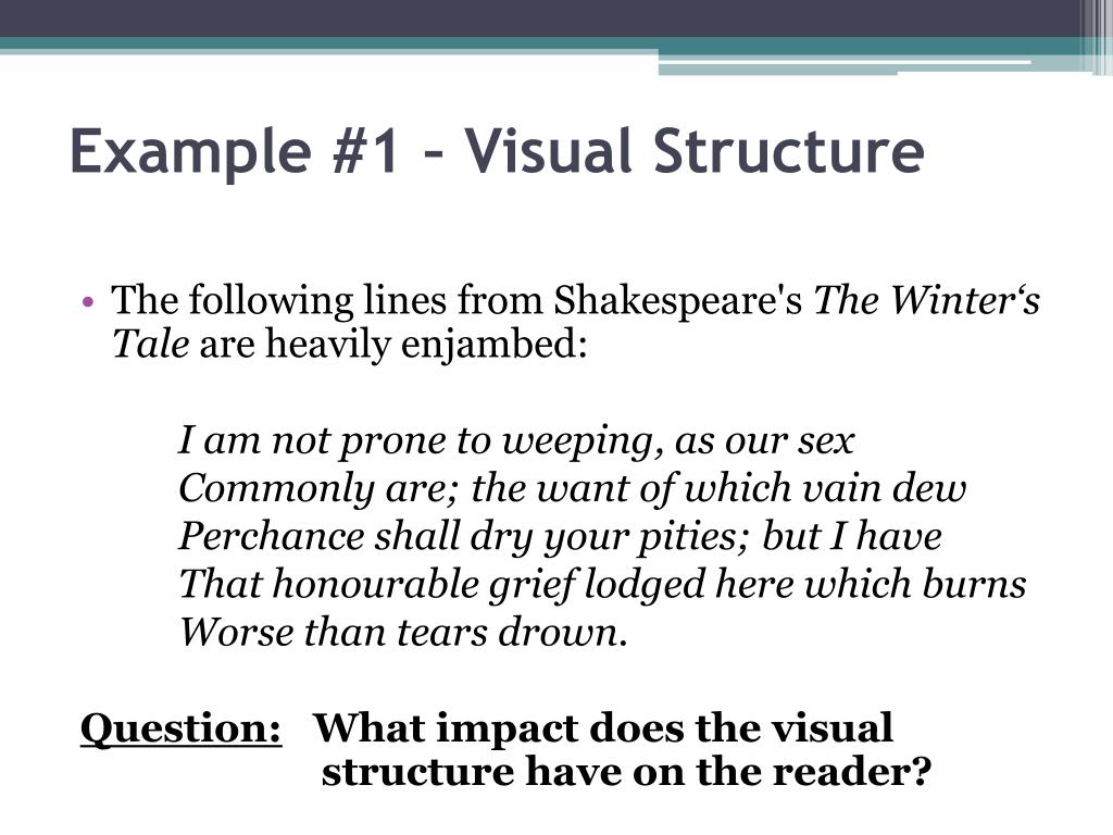 Example #1 – Visual Structure • The following lines from Shakespeare's The Winter‘s Tale are heavily enjambed: I am not prone to weeping, as our sex Commonly are; the want of which vain dew Perchance shall dry your pities; but I have That honourable grief lodged here which burns Worse than tears drown. Question: What impact does the visual structure have on the reader?