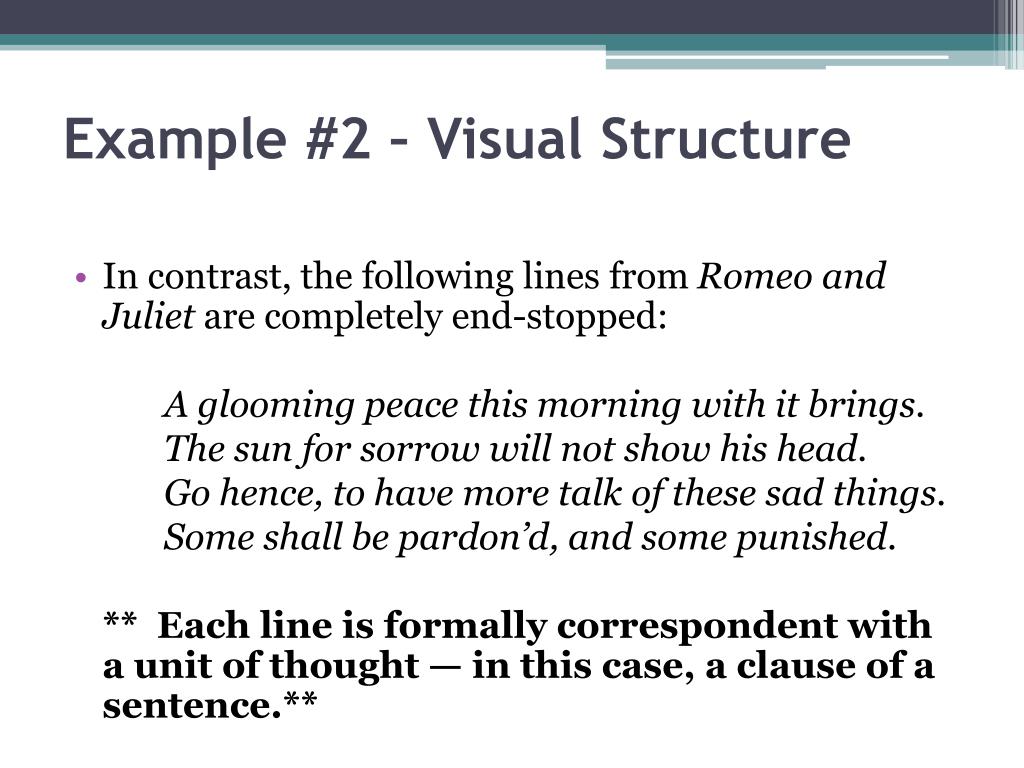 Example #2 – Visual Structure • In contrast, the following lines from Romeo and Juliet are completely end-stopped: A glooming peace this morning with it brings. The sun for sorrow will not show his head. Go hence, to have more talk of these sad things. Some shall be pardon’d, and some punished. ** Each line is formally correspondent with a unit of thought — in this case, a clause of a sentence.**