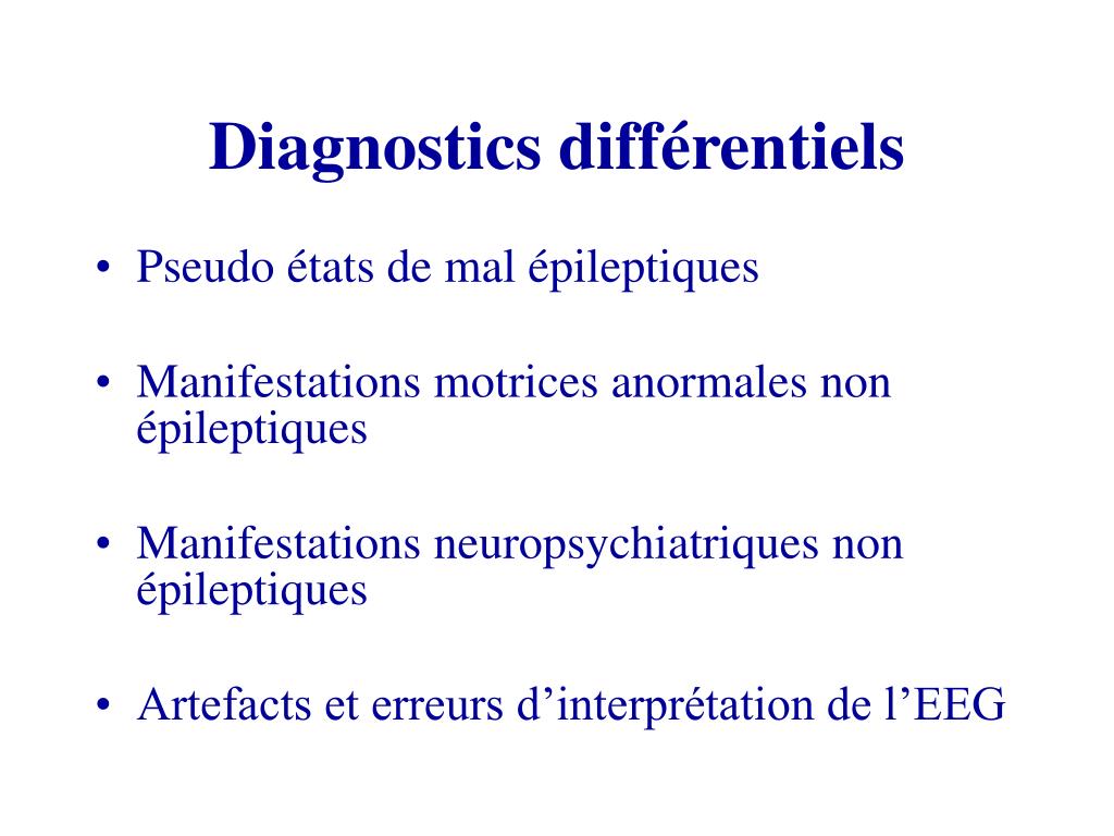 Diagnostics différentiels • Pseudo états de mal épileptiques • Manifestations motrices anormales non épileptiques • Manifestations neuropsychiatriques non épileptiques • Artefacts et erreurs d’interprétation de l’EEG