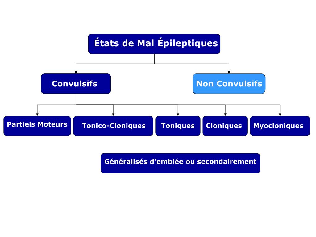 États de Mal Épileptiques Convulsifs NonConvulsifs Partiels Moteurs Toniques Cloniques Myocloniques Tonico-Cloniques Généralisés d’emblée ou secondairement