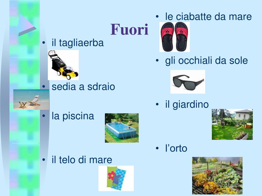 il tagliaerba sedia a sdraio la piscina il telo di mare le ciabatte da mare gli occhiali da sole il giardino l’orto Fuori