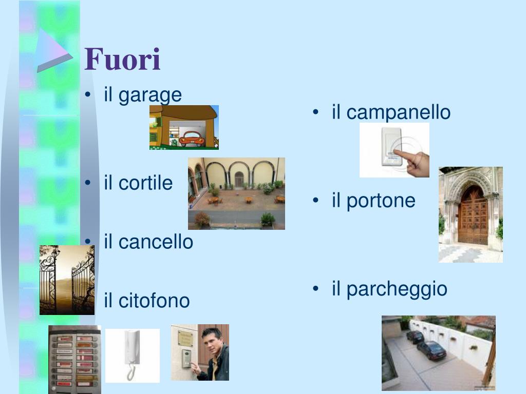 il garage il cortile il cancello il citofono il campanello il portone il parcheggio Fuori
