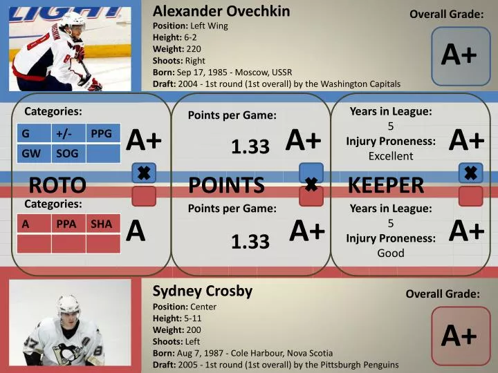 Alexander Ovechkin Overall Grade: A+ OVERALL Average Draft Pick: roto points keeper 1.1 Sydney Crosby Overall Grade: A+ Average Draft Pick: OVERALL 3.2 roto points keeper
