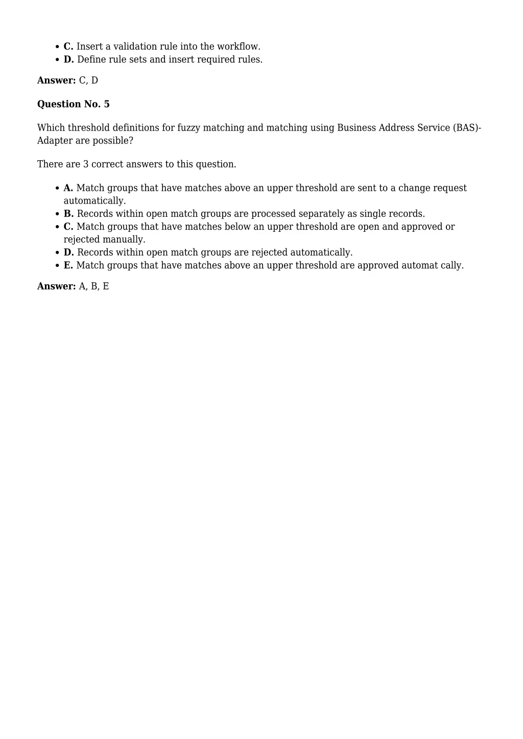 C. Insert a validation rule into the workflow. D. Define rule sets and insert required rules. Answer: C, D Question No. 5 Which threshold definitions for fuzzy matching and matching using Business Address Service (BAS)- Adapter are possible? There are 3 correct answers to this question. A. Match groups that have matches above an upper threshold are sent to a change request automatically. B. Records within open match groups are processed separately as single records. C. Match groups that have matches below an upper threshold are open and approved or rejected manually. D. Records within open match groups are rejected automatically. E. Match groups that have matches above an upper threshold are approved automat cally. Answer: A, B, E