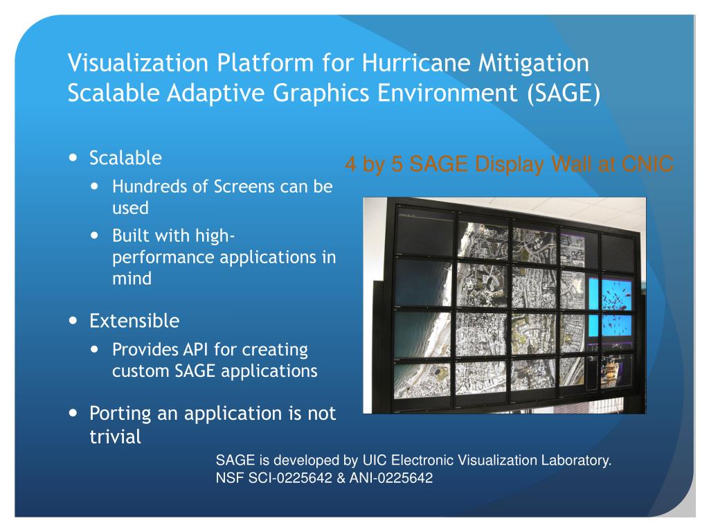 Visualization Platform for Hurricane MitigationScalable Adaptive Graphics Environment (SAGE) • Scalable • Hundreds of Screens can be used • Built with high-performance applications in mind • Extensible • Provides API for creating custom SAGE applications • Porting an application is not trivial 4 by 5 SAGE Display Wall at CNIC SAGE is developed by UIC Electronic Visualization Laboratory. NSF SCI-0225642 & ANI-0225642