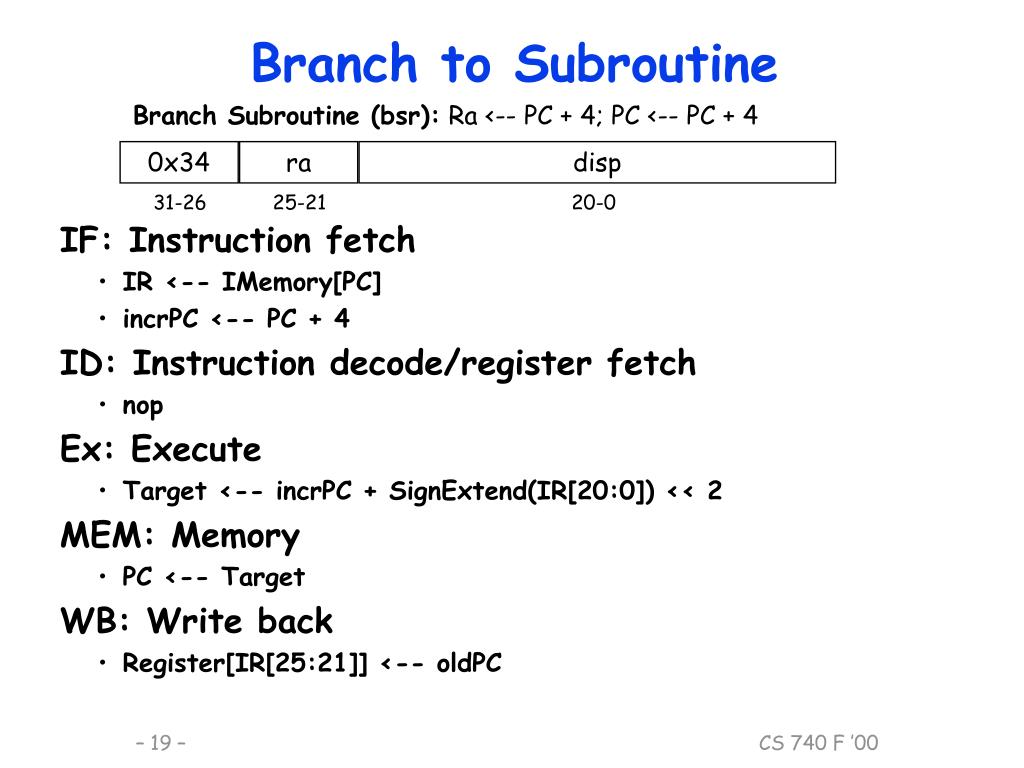 0x34 ra disp 31-26 25-21 20-0 Branch to Subroutine Branch Subroutine (bsr): Ra <-- PC + 4; PC <-- PC + 4 • IF: Instruction fetch • IR <-- IMemory[PC] • incrPC <-- PC + 4 • ID: Instruction decode/register fetch • nop • Ex: Execute • Target <-- incrPC + SignExtend(IR[20:0]) << 2 • MEM: Memory • PC <-- Target • WB: Write back • Register[IR[25:21]] <-- oldPC