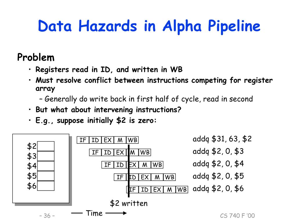 addq $31, 63, $2 IF ID EX M WB $2 addq $2, 0, $3 IF ID EX M WB $3 addq $2, 0, $4 $4 IF ID EX M WB $5 addq $2, 0, $5 IF ID EX M WB $6 addq $2, 0, $6 IF ID EX M WB Time Data Hazards in Alpha Pipeline • Problem • Registers read in ID, and written in WB • Must resolve conflict between instructions competing for register array • Generally do write back in first half of cycle, read in second • But what about intervening instructions? • E.g., suppose initially $2 is zero: $2 written