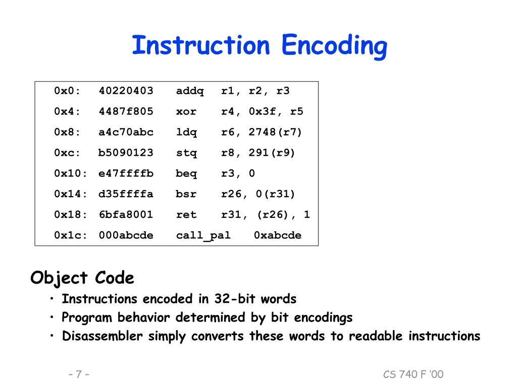 Instruction Encoding 0x0: 40220403 addq r1, r2, r3 0x4: 4487f805 xor r4, 0x3f, r5 0x8: a4c70abc ldq r6, 2748(r7) 0xc: b5090123 stq r8, 291(r9) 0x10: e47ffffb beq r3, 0 0x14: d35ffffa bsr r26, 0(r31) 0x18: 6bfa8001 ret r31, (r26), 1 0x1c: 000abcde call_pal 0xabcde • Object Code • Instructions encoded in 32-bit words • Program behavior determined by bit encodings • Disassembler simply converts these words to readable instructions