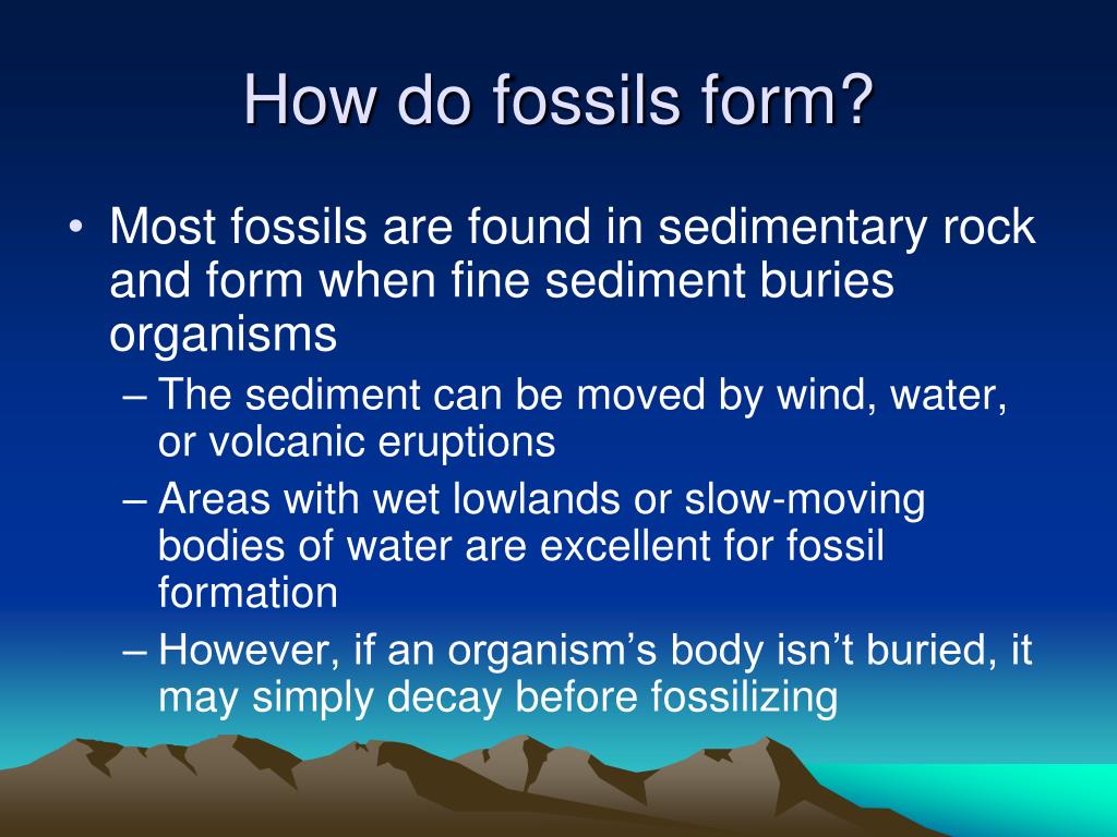 How do fossils form? • Most fossils are found in sedimentary rock and form when fine sediment buries organisms • The sediment can be moved by wind, water, or volcanic eruptions • Areas with wet lowlands or slow-moving bodies of water are excellent for fossil formation • However, if an organism’s body isn’t buried, it may simply decay before fossilizing