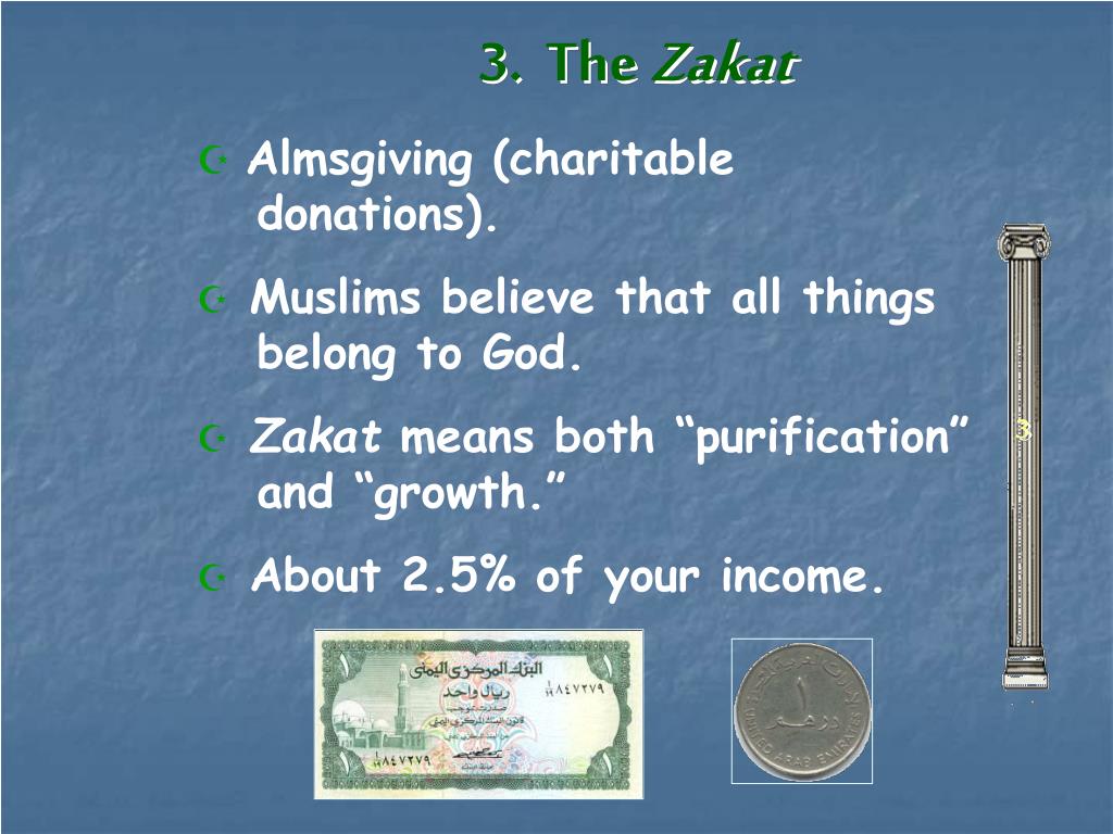 3. The Zakat • Almsgiving (charitable donations). • Muslims believe that all things belong to God. • Zakat means both “purification” and “growth.” • About 2.5% of your income. 3
