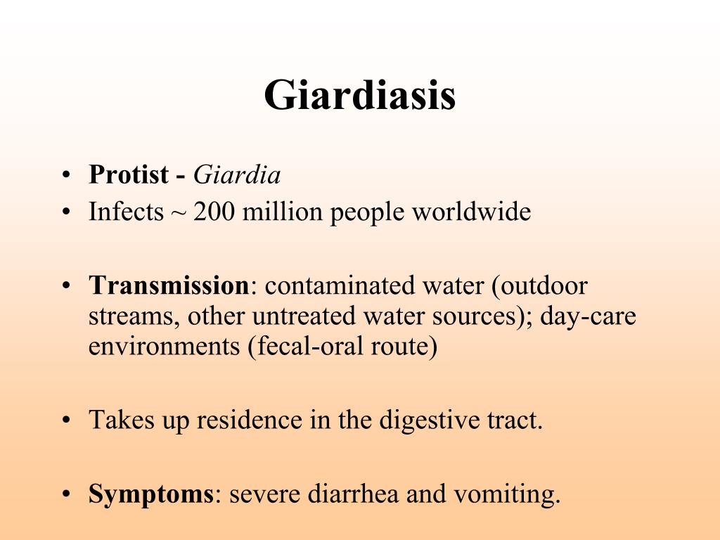 Giardiasis • Protist - Giardia • Infects ~ 200 million people worldwide • Transmission: contaminated water (outdoor streams, other untreated water sources); day-care environments (fecal-oral route) • Takes up residence in the digestive tract. • Symptoms: severe diarrhea and vomiting.