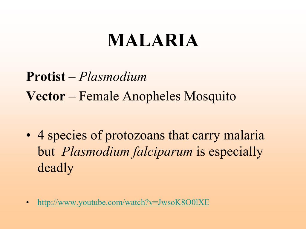 MALARIA Protist – Plasmodium Vector – Female Anopheles Mosquito • 4 species of protozoans that carry malaria but Plasmodium falciparum is especially deadly • http://www.youtube.com/watch?v=JwsoK8O0lXE