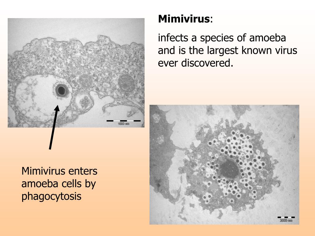 Mimivirus: infects a species of amoeba and is the largest known virus ever discovered. Mimivirus enters amoeba cells by phagocytosis