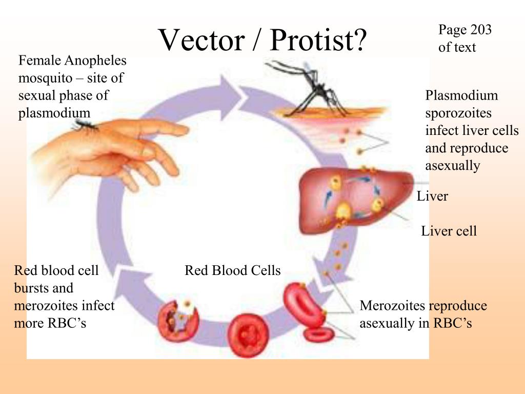 Page 203 of text Vector / Protist? Female Anopheles mosquito – site of sexual phase of plasmodium Plasmodium sporozoites infect liver cells and reproduce asexually Liver Liver cell Red blood cell bursts and merozoites infect more RBC’s Red Blood Cells Merozoites reproduce asexually in RBC’s