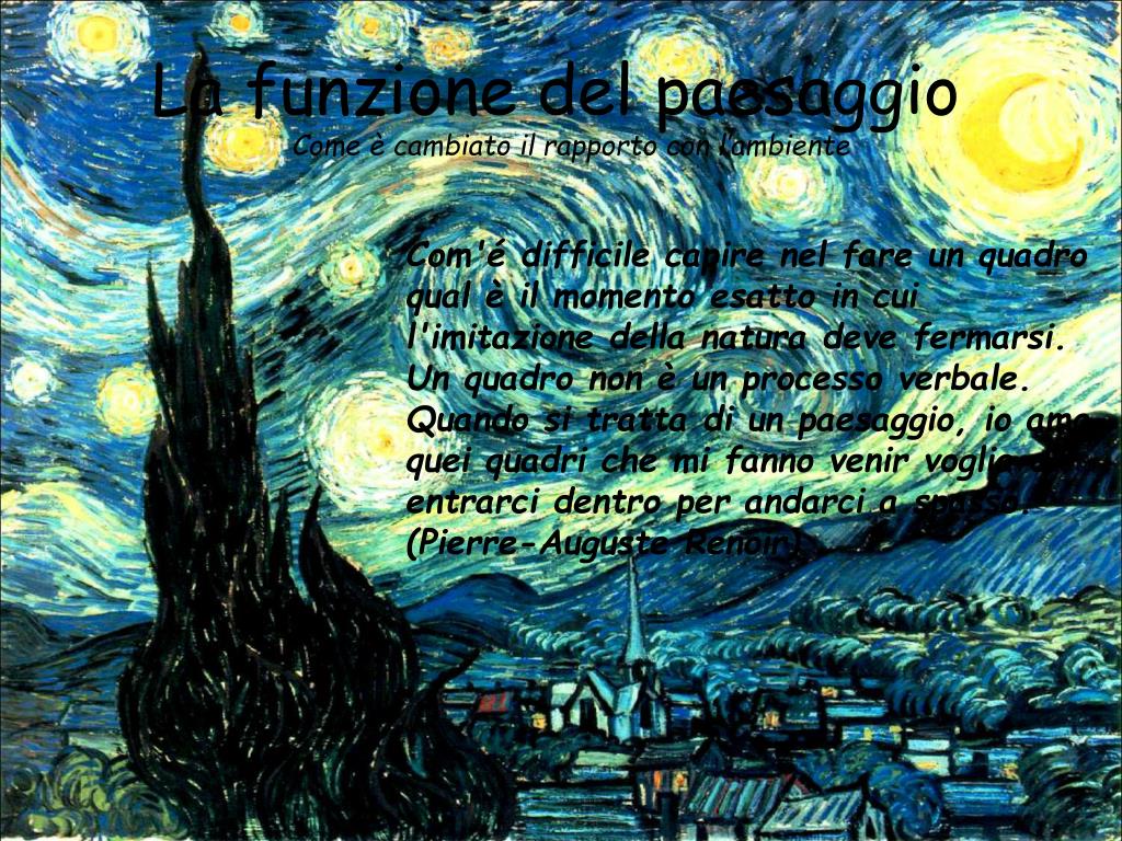 La funzione del paesaggio Come è cambiato il rapporto con l’ambiente Com'é difficile capire nel fare un quadro qual è il momento esatto in cui l'imitazione della natura deve fermarsi. Un quadro non è un processo verbale. Quando si tratta di un paesaggio, io amo quei quadri che mi fanno venir voglia di entrarci dentro per andarci a spasso. (Pierre-Auguste Renoir)
