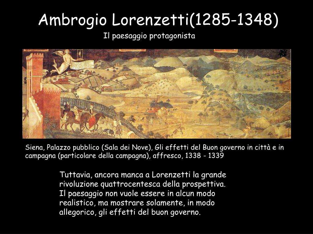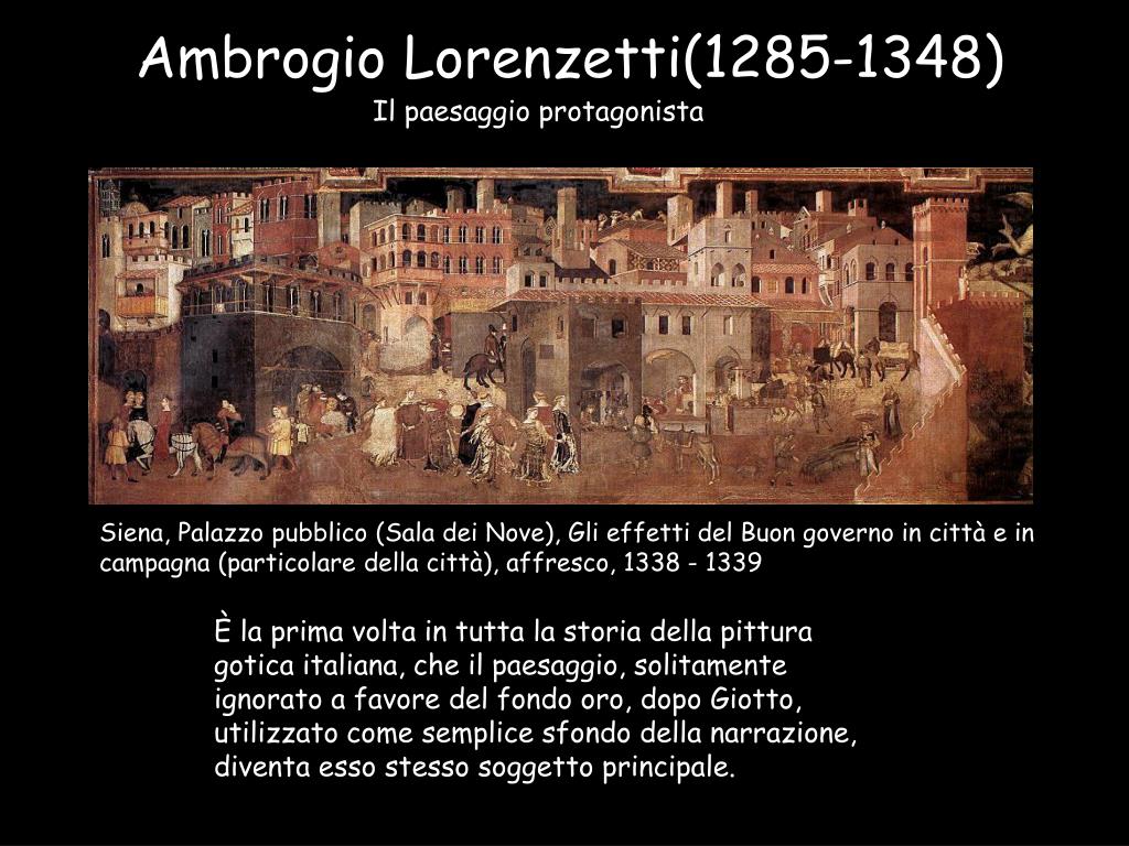 Ambrogio Lorenzetti(1285-1348) Il paesaggio protagonista Siena, Palazzo pubblico (Sala dei Nove), Gli effetti del Buon governo in città e in campagna (particolare della città), affresco, 1338 - 1339 È la prima volta in tutta la storia della pittura gotica italiana, che il paesaggio, solitamente ignorato a favore del fondo oro, dopo Giotto, utilizzato come semplice sfondo della narrazione, diventa esso stesso soggetto principale.
