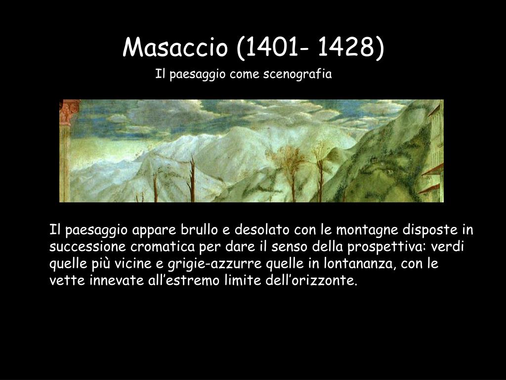 Masaccio (1401- 1428) Il paesaggio come scenografia Il paesaggio appare brullo e desolato con le montagne disposte in successione cromatica per dare il senso della prospettiva: verdi quelle più vicine e grigie-azzurre quelle in lontananza, con le vette innevate all’estremo limite dell’orizzonte.