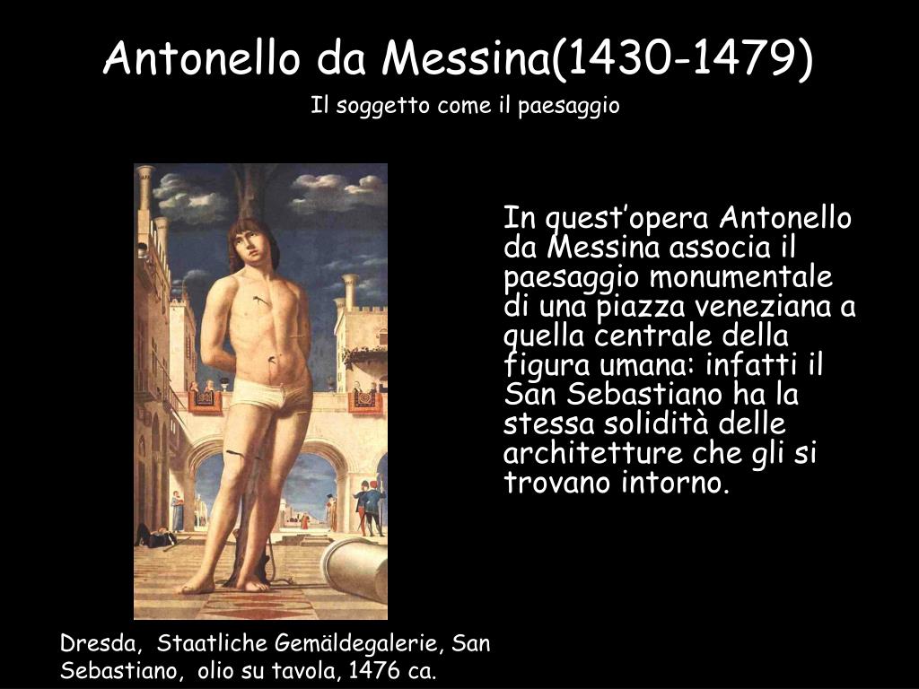 Antonello da Messina(1430-1479) Il soggetto come il paesaggio In quest’opera Antonello da Messina associa il paesaggio monumentale di una piazza veneziana a quella centrale della figura umana: infatti il San Sebastiano ha la stessa solidità delle architetture che gli si trovano intorno. Dresda, Staatliche Gemäldegalerie, San Sebastiano, olio su tavola, 1476 ca.