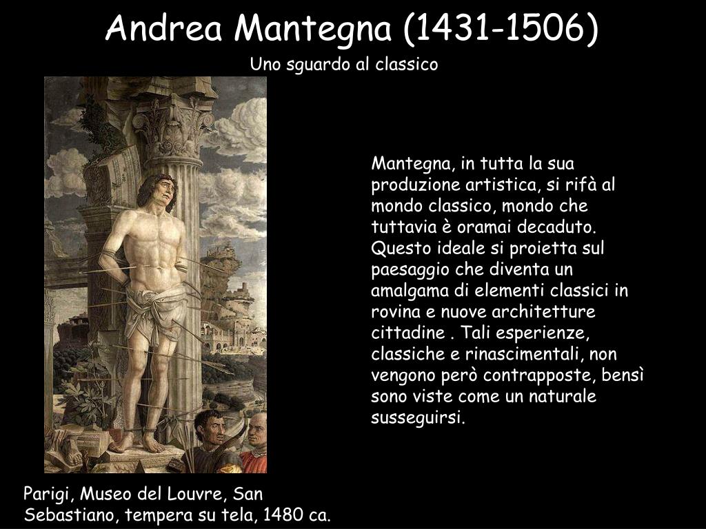 Andrea Mantegna (1431-1506) Uno sguardo al classico Mantegna, in tutta la sua produzione artistica, si rifà al mondo classico, mondo che tuttavia è oramai decaduto. Questo ideale si proietta sul paesaggio che diventa un amalgama di elementi classici in rovina e nuove architetture cittadine . Tali esperienze, classiche e rinascimentali, non vengono però contrapposte, bensì sono viste come un naturale susseguirsi. Parigi, Museo del Louvre, San Sebastiano, tempera su tela, 1480 ca.