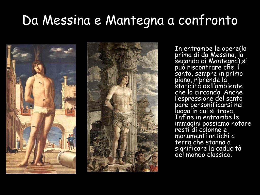 Da Messina e Mantegna a confronto In entrambe le opere(la prima di da Messina, la seconda di Mantegna),si può riscontrare che il santo, sempre in primo piano, riprende la staticità dell’ambiente che lo circonda. Anche l’espressione del santo pare personificarsi nel luogo in cui si trova. Infine in entrambe le immagini possiamo notare resti di colonne e monumenti antichi a terra che stanno a significare la caducità del mondo classico.