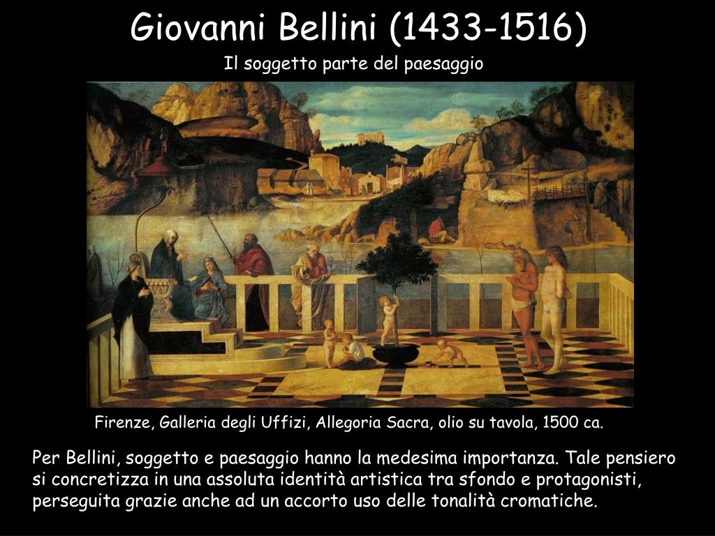 Giovanni Bellini (1433-1516) Il soggetto parte del paesaggio Firenze, Galleria degli Uffizi, Allegoria Sacra, olio su tavola, 1500 ca. Per Bellini, soggetto e paesaggio hanno la medesima importanza. Tale pensiero si concretizza in una assoluta identità artistica tra sfondo e protagonisti, perseguita grazie anche ad un accorto uso delle tonalità cromatiche.
