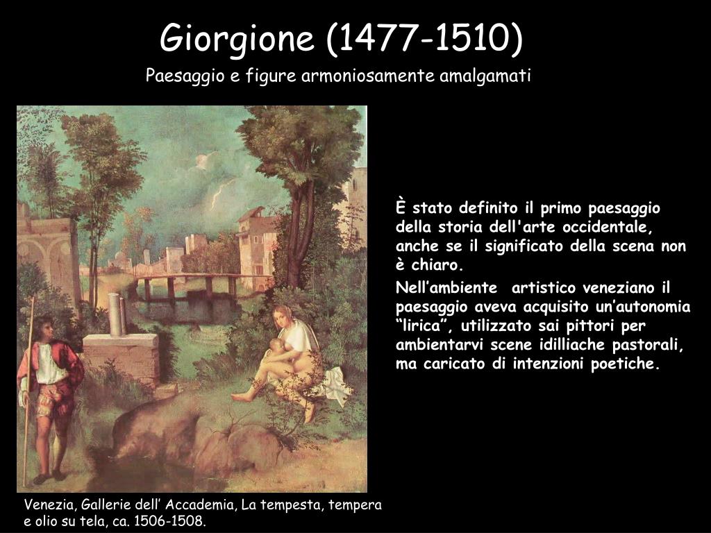 Giorgione (1477-1510) Paesaggio e figure armoniosamente amalgamati È stato definito il primo paesaggio della storia dell'arte occidentale, anche se il significato della scena non è chiaro. Nell’ambiente artistico veneziano il paesaggio aveva acquisito un’autonomia “lirica”, utilizzato sai pittori per ambientarvi scene idilliache pastorali, ma caricato di intenzioni poetiche. Venezia, Gallerie dell’ Accademia, La tempesta, tempera e olio su tela, ca. 1506-1508.