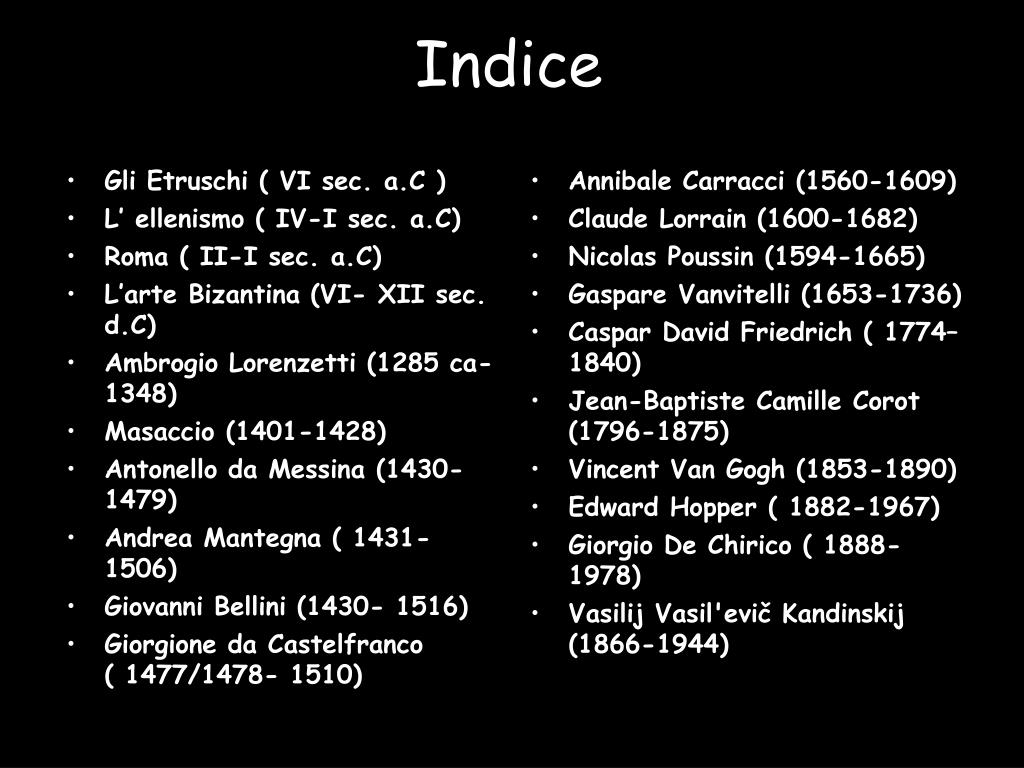 Indice • Gli Etruschi ( VI sec. a.C ) • L’ ellenismo ( IV-I sec. a.C) • Roma ( II-I sec. a.C) • L’arte Bizantina (VI- XII sec. d.C) • Ambrogio Lorenzetti (1285 ca-1348) • Masaccio (1401-1428) • Antonello da Messina (1430-1479) • Andrea Mantegna ( 1431- 1506) • Giovanni Bellini (1430- 1516) • Giorgione da Castelfranco ( 1477/1478- 1510) • Annibale Carracci (1560-1609) • Claude Lorrain (1600-1682) • Nicolas Poussin (1594-1665) • Gaspare Vanvitelli (1653-1736) • Caspar David Friedrich ( 1774– 1840) • Jean-Baptiste Camille Corot (1796-1875) • Vincent Van Gogh (1853-1890) • Edward Hopper ( 1882-1967) • Giorgio De Chirico ( 1888-1978) • Vasilij Vasil'evič Kandinskij (1866-1944)