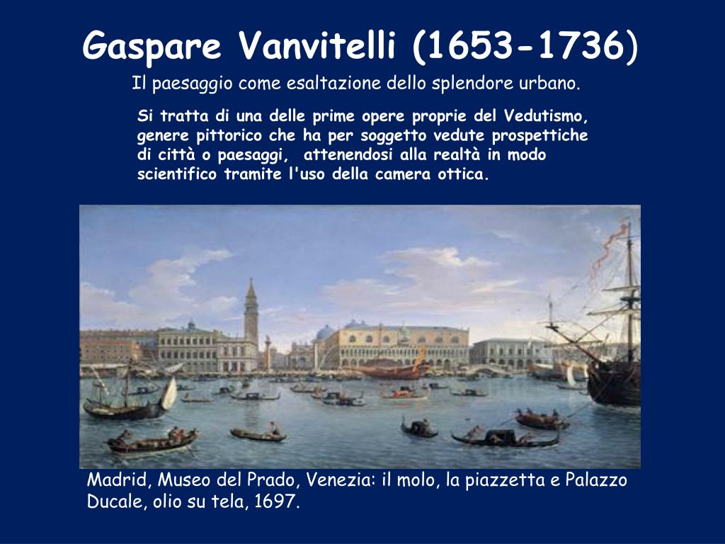 Gaspare Vanvitelli (1653-1736) Il paesaggio come esaltazione dello splendore urbano. Si tratta di una delle prime opere proprie del Vedutismo, genere pittorico che ha per soggetto vedute prospettiche di città o paesaggi, attenendosi alla realtà in modo scientifico tramite l'uso della camera ottica. Madrid, Museo del Prado, Venezia: il molo, la piazzetta e Palazzo Ducale, olio su tela, 1697.