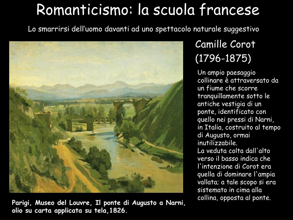 Romanticismo: la scuola francese Lo smarrirsi dell’uomo davanti ad uno spettacolo naturale suggestivo Camille Corot (1796-1875) Un ampio paesaggio collinare è attraversato da un fiume che scorre tranquillamente sotto le antiche vestigia di un ponte, identificato con quello nei pressi di Narni, in Italia, costruito al tempo di Augusto, ormai inutilizzabile.La veduta colta dall'alto verso il basso indica che l'intenzione di Corot era quella di dominare l'ampia vallata; a tale scopo si era sistemato in cima alla collina, opposta al ponte. Parigi, Museo del Louvre, Il ponte di Augusto a Narni, olio su carta applicata su tela,1826.