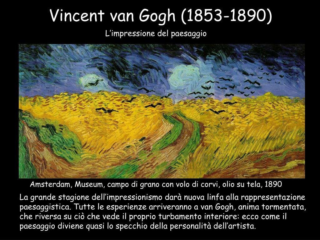 Vincent van Gogh (1853-1890) L’impressione del paesaggio Amsterdam, Museum, campo di grano con volo di corvi, olio su tela, 1890 La grande stagione dell’impressionismo darà nuova linfa alla rappresentazione paesaggistica. Tutte le esperienze arriveranno a van Gogh, anima tormentata, che riversa su ciò che vede il proprio turbamento interiore: ecco come il paesaggio diviene quasi lo specchio della personalità dell’artista.