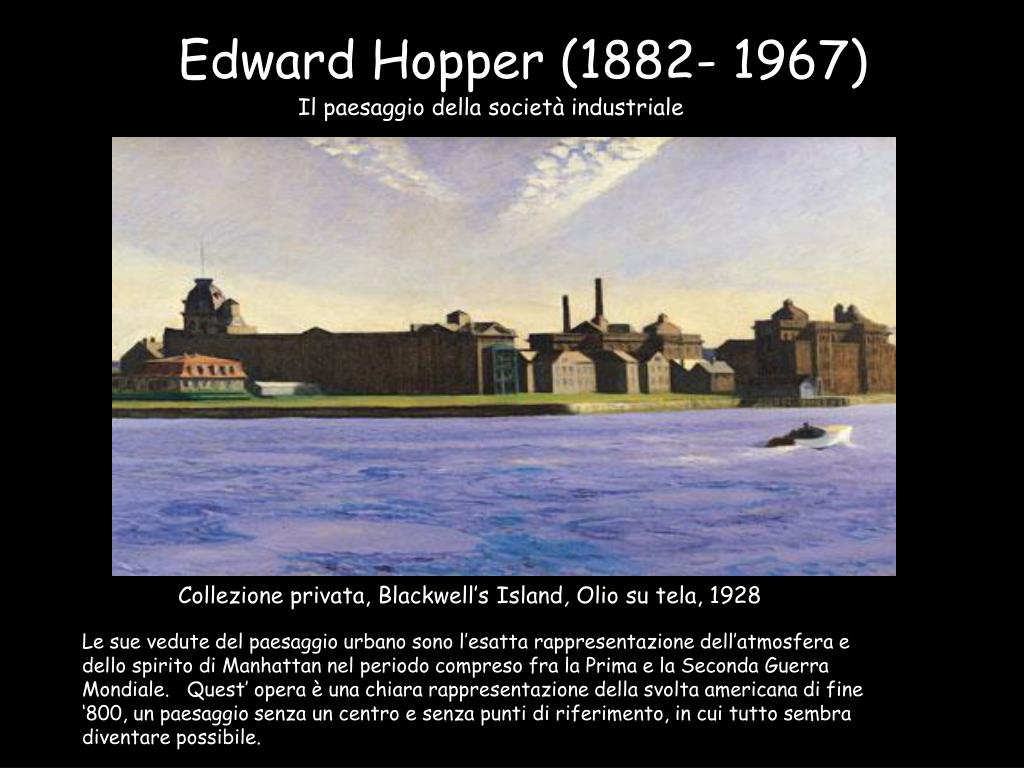 Edward Hopper (1882- 1967) Il paesaggio della società industriale Collezione privata, Blackwell’s Island, Olio su tela, 1928 Le sue vedute del paesaggio urbano sono l’esatta rappresentazione dell’atmosfera e dello spirito di Manhattan nel periodo compreso fra la Prima e la Seconda Guerra Mondiale. Quest’ opera è una chiara rappresentazione della svolta americana di fine ‘800, un paesaggio senza un centro e senza punti di riferimento, in cui tutto sembra diventare possibile.