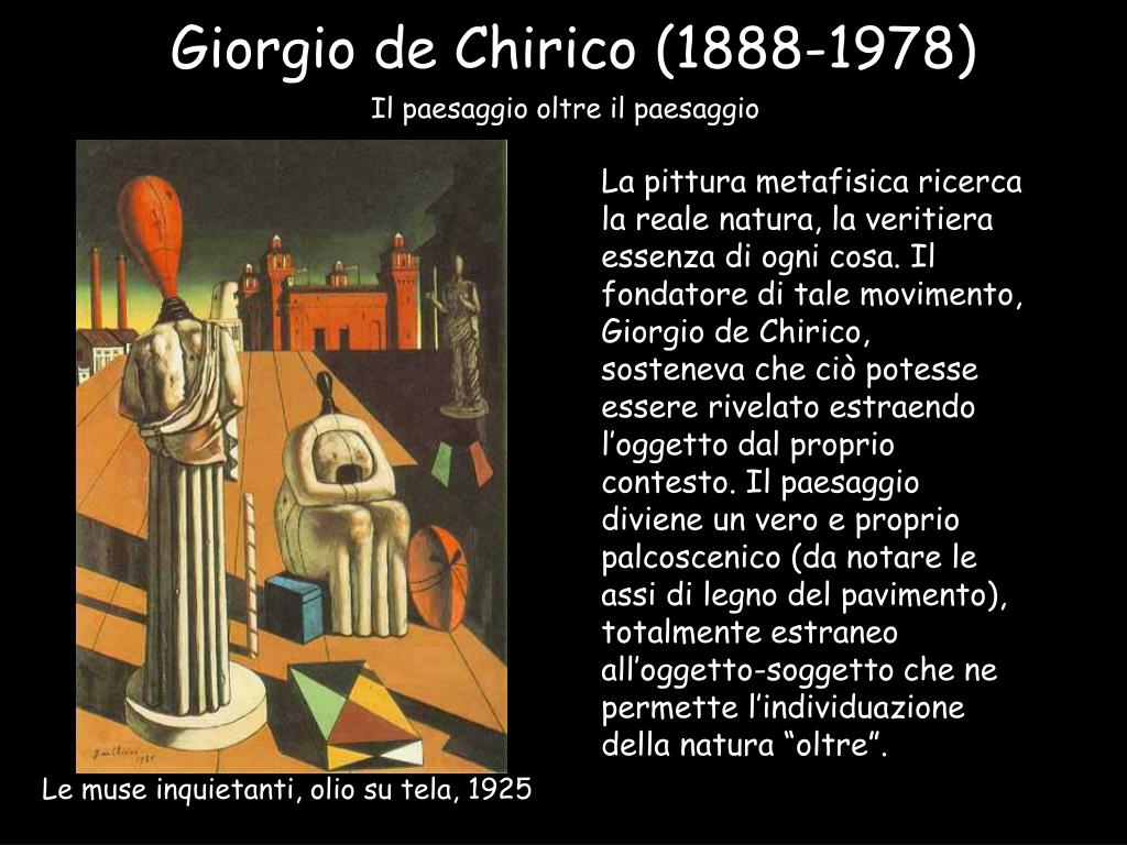 Giorgio de Chirico (1888-1978) Il paesaggio oltre il paesaggio La pittura metafisica ricerca la reale natura, la veritiera essenza di ogni cosa. Il fondatore di tale movimento, Giorgio de Chirico, sosteneva che ciò potesse essere rivelato estraendo l’oggetto dal proprio contesto. Il paesaggio diviene un vero e proprio palcoscenico (da notare le assi di legno del pavimento), totalmente estraneo all’oggetto-soggetto che ne permette l’individuazione della natura “oltre”. Le muse inquietanti, olio su tela, 1925