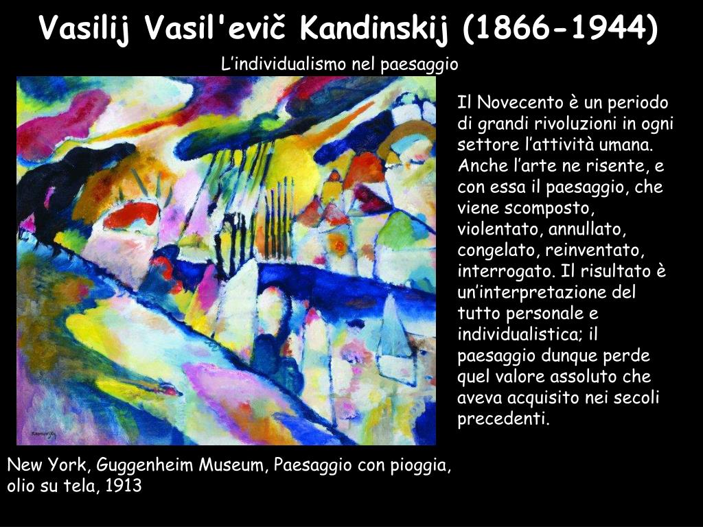 Vasilij Vasil'evič Kandinskij (1866-1944) L’individualismo nel paesaggio Il Novecento è un periodo di grandi rivoluzioni in ogni settore l’attività umana. Anche l’arte ne risente, e con essa il paesaggio, che viene scomposto, violentato, annullato, congelato, reinventato, interrogato. Il risultato è un’interpretazione del tutto personale e individualistica; il paesaggio dunque perde quel valore assoluto che aveva acquisito nei secoli precedenti. New York, Guggenheim Museum, Paesaggio con pioggia, olio su tela, 1913