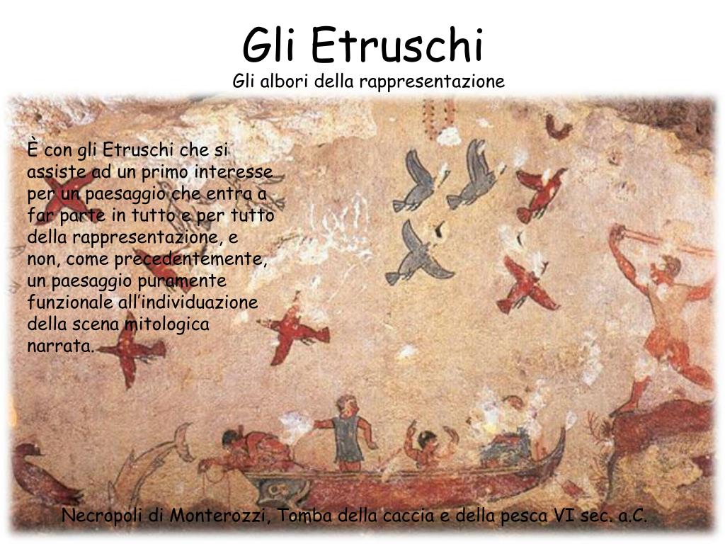 Gli Etruschi Gli albori della rappresentazione È con gli Etruschi che si assiste ad un primo interesse per un paesaggio che entra a far parte in tutto e per tutto della rappresentazione, e non, come precedentemente, un paesaggio puramente funzionale all’individuazione della scena mitologica narrata. Necropoli di Monterozzi, Tomba della caccia e della pesca VI sec. a.C.