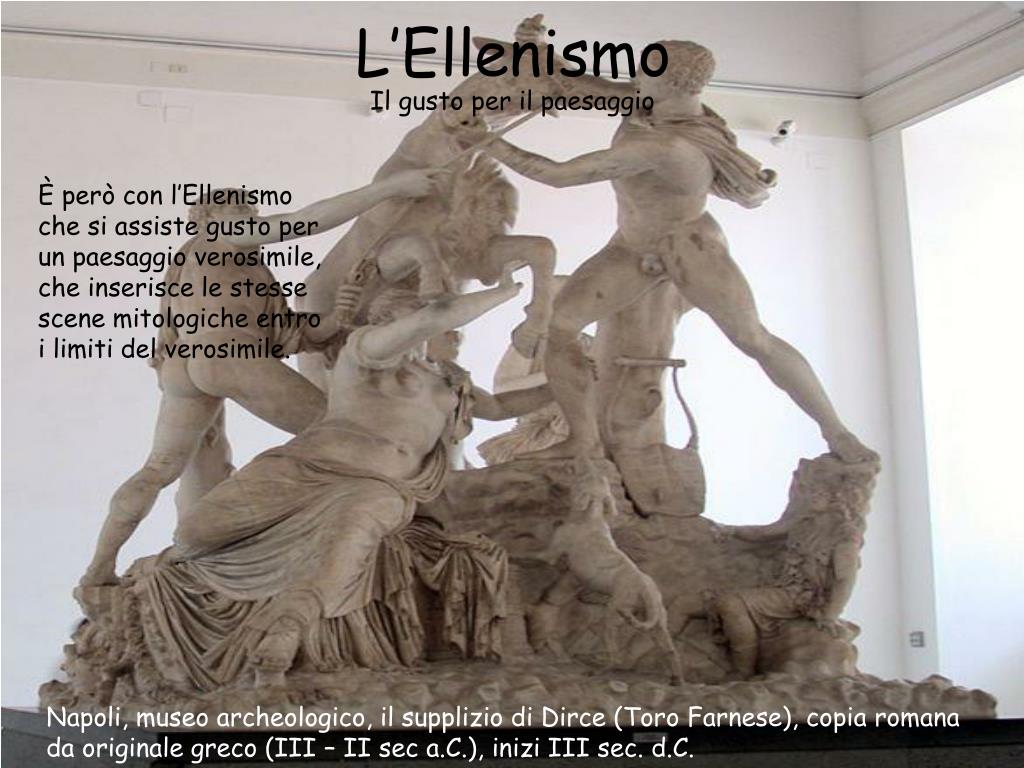 L’Ellenismo Il gusto per il paesaggio È però con l’Ellenismo che si assiste gusto per un paesaggio verosimile, che inserisce le stesse scene mitologiche entro i limiti del verosimile. Napoli, museo archeologico, il supplizio di Dirce (Toro Farnese), copia romana da originale greco (III – II sec a.C.), inizi III sec. d.C.