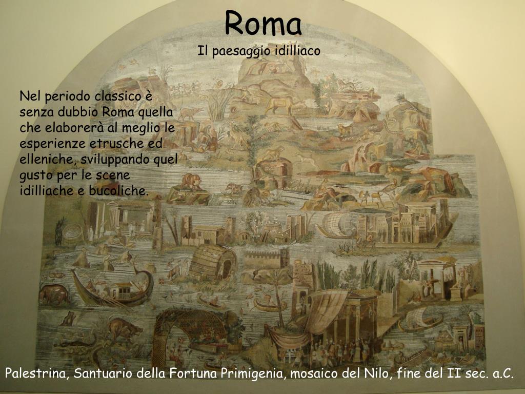 Roma Il paesaggio idilliaco Nel periodo classico è senza dubbio Roma quella che elaborerà al meglio le esperienze etrusche ed elleniche, sviluppando quel gusto per le scene idilliache e bucoliche. Palestrina, Santuario della Fortuna Primigenia, mosaico del Nilo, fine del II sec. a.C.
