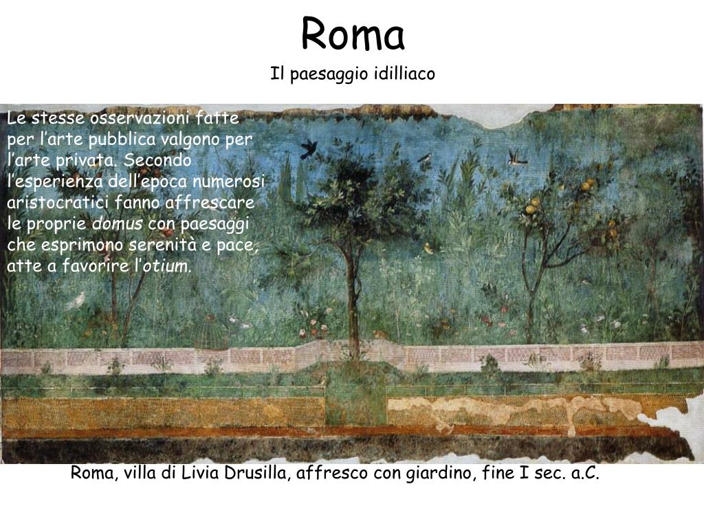 Roma Il paesaggio idilliaco Le stesse osservazioni fatte per l’arte pubblica valgono per l’arte privata. Secondo l’esperienza dell’epoca numerosi aristocratici fanno affrescare le proprie domus con paesaggi che esprimono serenità e pace, atte a favorire l’otium. Roma, villa di Livia Drusilla, affresco con giardino, fine I sec. a.C.