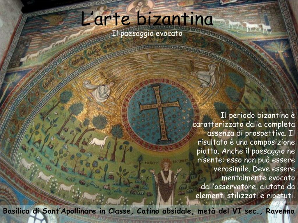L’arte bizantina Il paesaggio evocato Il periodo bizantino è caratterizzato dalla completa assenza di prospettiva. Il risultato è una composizione piatta. Anche il paesaggio ne risente: esso non può essere verosimile. Deve essere mentalmente evocato dall’osservatore, aiutato da elementi stilizzati e ripetuti. Basilica di Sant’Apollinare in Classe, Catino absidale, metà del VI sec., Ravenna