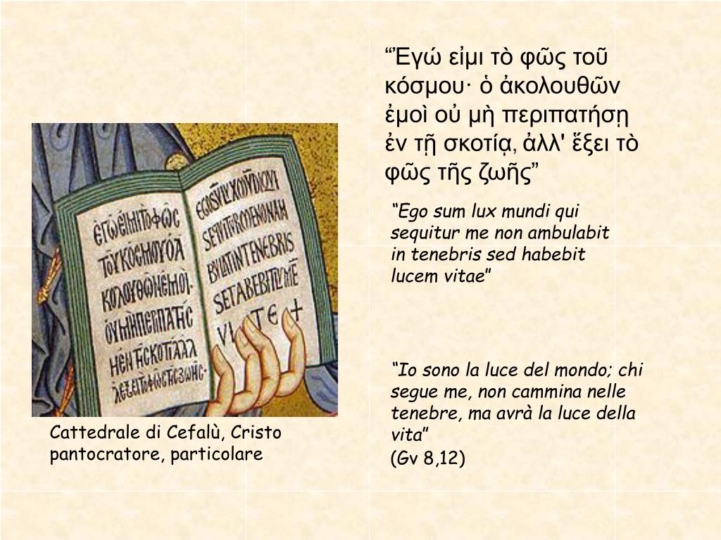 “Ἐγώ εἰμι τὸ φῶς τοῦ κόσμου· ὁ ἀκολουθῶν ἐμοὶ οὐ μὴ περιπατήσῃ ἐν τῇ σκοτίᾳ,ἀλλ' ἕξει τὸ φῶς τῆς ζωῆς” “Ego sum lux mundi qui sequitur me non ambulabit in tenebris sed habebit lucem vitae” “Io sono la luce del mondo; chi segue me, non cammina nelle tenebre, ma avrà la luce della vita” (Gv 8,12) Cattedrale di Cefalù, Cristo pantocratore, particolare