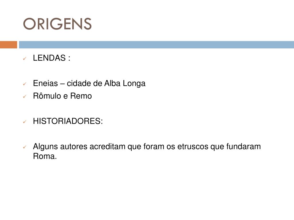 ORIGENS • LENDAS : • Eneias – cidade de Alba Longa • Rômulo e Remo • HISTORIADORES: • Alguns autores acreditam que foram os etruscos que fundaram Roma.