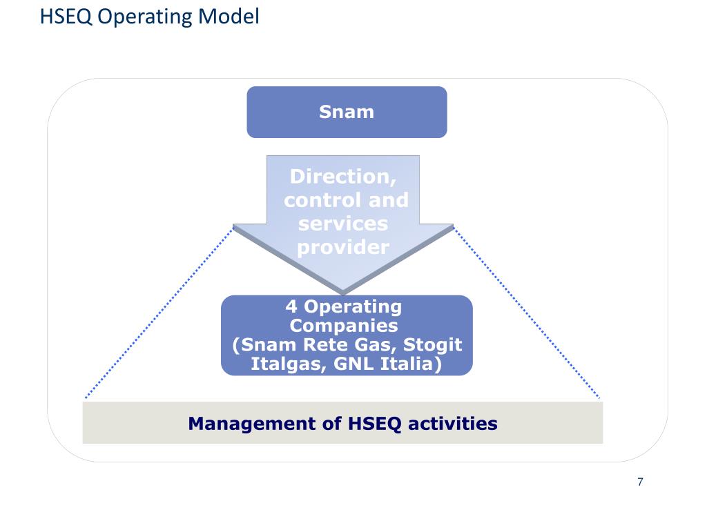 HSEQ Operating Model Snam Direction, control and services provider 4 Operating Companies (Snam Rete Gas, Stogit Italgas, GNL Italia) Management of HSEQ activities