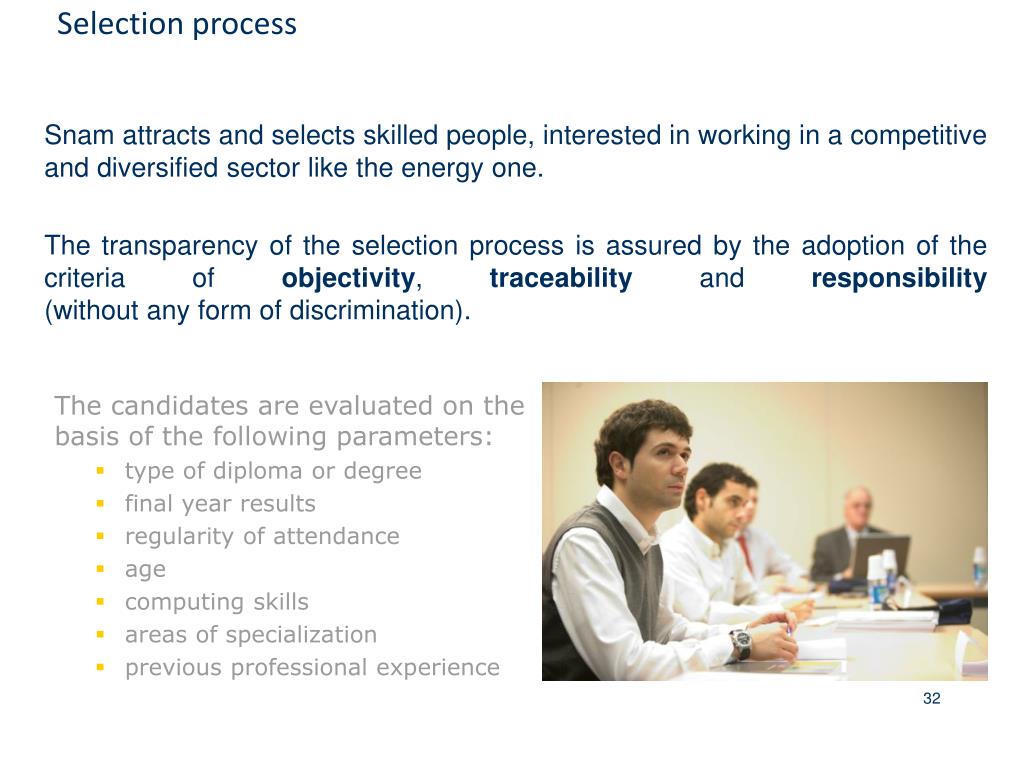 Selection process Snam attracts and selects skilled people, interested in working in a competitive and diversified sector like the energy one. The transparency of the selection process is assured by the adoption of the criteria of objectivity, traceability and responsibility(without any form of discrimination). The candidates are evaluated on the basis of the following parameters: • type of diploma or degree • final year results • regularity of attendance • age • computing skills • areas of specialization • previous professional experience