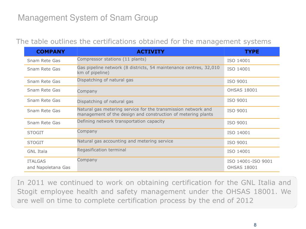 In 2011 we continued to work on obtaining certification for the GNL Italia and Stogit employee health and safety management under the OHSAS 18001. We are well on time to complete certification process by the end of 2012 Management System of Snam Group The table outlines the certifications obtained for the management systems