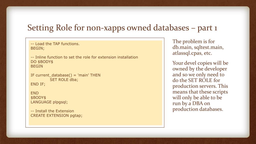 Setting Role for non-xapps owned databases – part 1 The problem is for db.main, sqltest.main, atlassql.cpas, etc. Your devel copies will be owned by the developer and so we only need to do the SET ROLE for production servers. This means that these scripts will only be able to be run by a DBA on production databases. -- Load the TAP functions. BEGIN; -- Inline function to set the role for extension installation DO $BODY$ BEGIN IF current_database() = 'main' THEN SET ROLE dba; END IF; END $BODY$ LANGUAGE plpgsql; -- Install the Extension CREATE EXTENSION pgtap;
