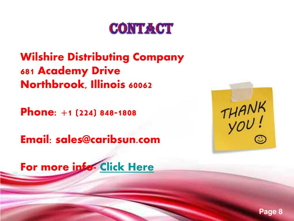 Contact Wilshire Distributing Company681 Academy Drive Northbrook, Illinois 60062 Phone: +1 (224) 848-1808 Email: sales@caribsun.com For more info- Click Here