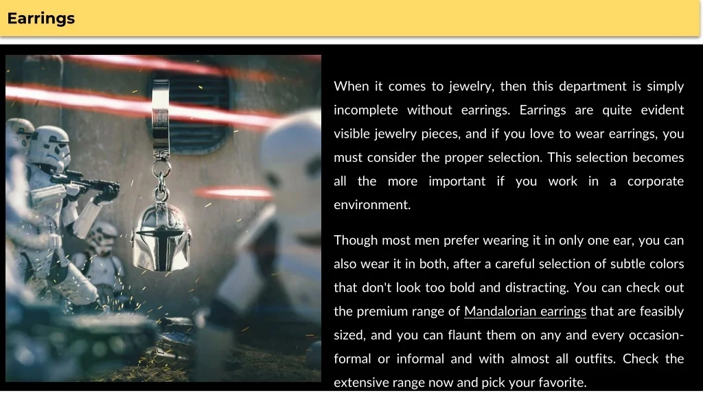 When it comes to jewelry, then this department is simply incomplete without earrings. Earrings are quite evident visible jewelry pieces, and if you love to wear earrings, you must consider the proper selection. This selection becomes all the more important if you work in a corporate environment. Though most men prefer wearing it in only one ear, you can also wear it in both, after a careful selection of subtle colors that don't look too bold and distracting. You can check out the premium range of Mandalorian earrings that are feasibly sized, and you can flaunt them on any and every occasion- formal or informal and with almost all outfits. Check the extensive range now and pick your favorite. Earrings a