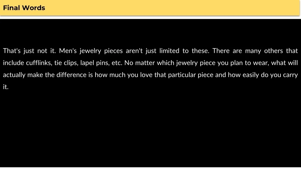 Final Words That's just not it. Men's jewelry pieces aren't just limited to these. There are many others that include cufflinks, tie clips, lapel pins, etc. No matter which jewelry piece you plan to wear, what will actually make the difference is how much you love that particular piece and how easily do you carry it.