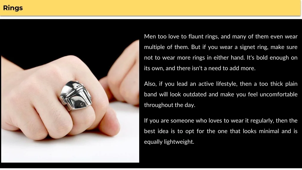 Men too love to flaunt rings, and many of them even wear multiple of them. But if you wear a signet ring, make sure not to wear more rings in either hand. It's bold enough on its own, and there isn't a need to add more. Also, if you lead an active lifestyle, then a too thick plain band will look outdated and make you feel uncomfortable throughout the day. If you are someone who loves to wear it regularly, then the best idea is to opt for the one that looks minimal and is equally lightweight. Rings a
